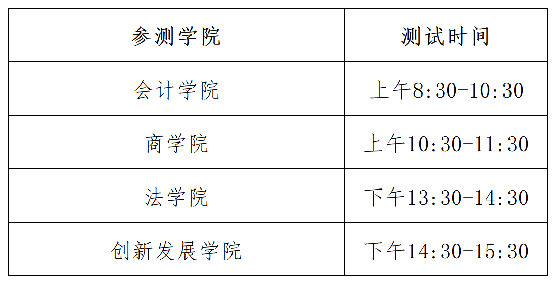 表2 学院南路校区各学院2023级学生测试时间