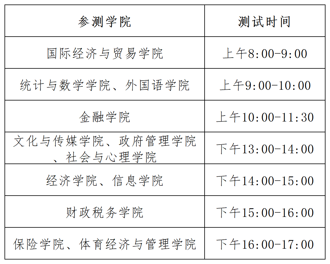 若因天气等不可抗力因素无法进行测试,请学生及时关注所在学院教务老师通知,或登录体育经济与管理学院网站(http://ssem.cufe.edu.cn),进入“通知公告栏”查看更改后的测试时间。其他未尽事宜,另行通知。